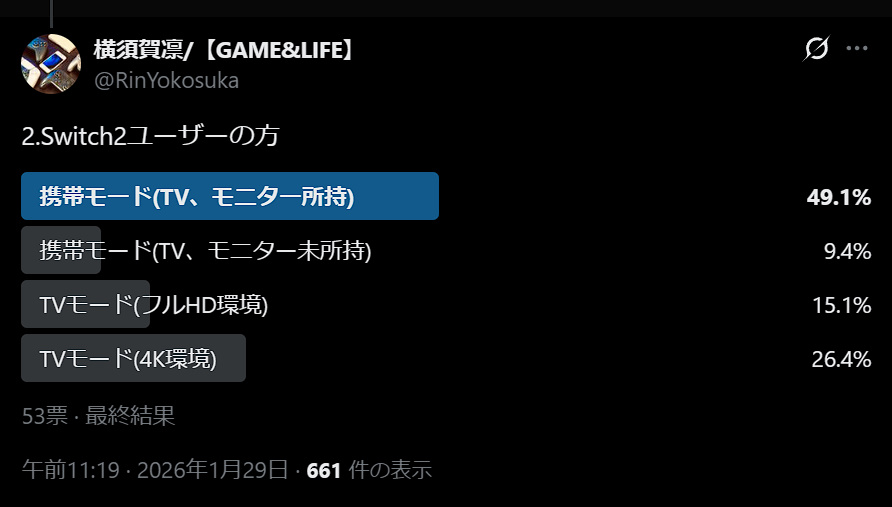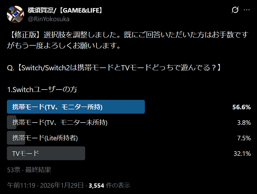 気になって夜しか眠れないので実際にXで投票をしてみた。「Switch/Switch2は携帯モードとTVモードどっちで遊んでる?」というシンプルなもの。